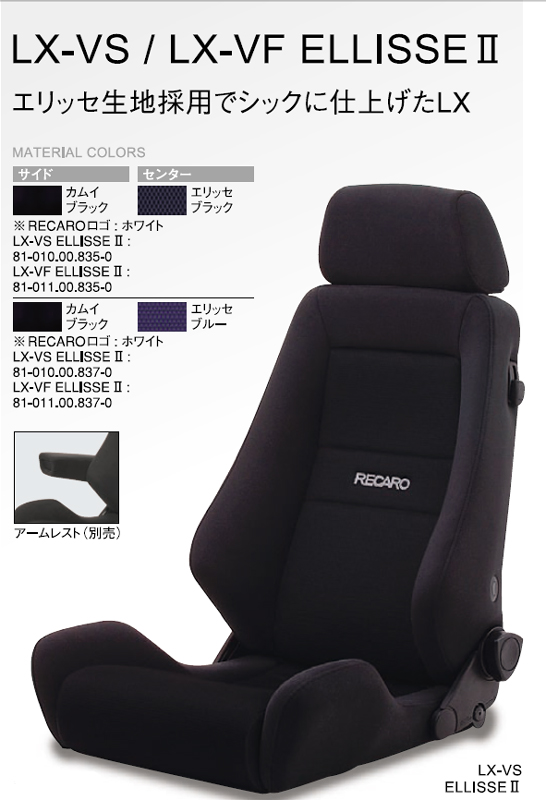 ■マテリアル&カラー カムブラック×エリッセブラック LX-VS(81-010.00.835-0)LX-VF(81-011.00.835-0) カムイブラック×エリッセブルー LX-VS(81-010.00.837-0)LX-VF(81-011.00.837-0) RECAROロゴ:ホワイト