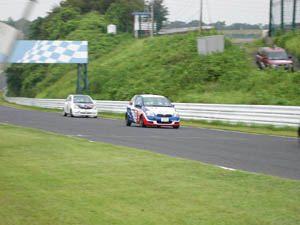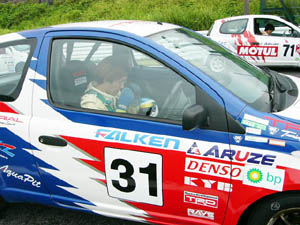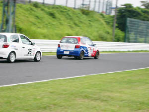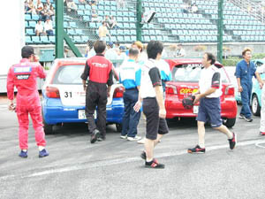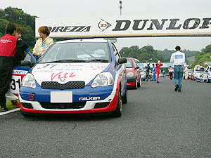 ![]() 我らがトライアルヴィッツは、予選B組!! A組と比べると、いつも上位に入ってくる選手は少ない! どちらかというと、ラッキーな組だったので、この組でトップをとって 決勝は1列目からのスタートといきたかったのですが…。 さぁ、予選のスタート!! 始めの2、3周まではトップタイムを出していたものの、少しづつ抜かれ出して 4周目には3位に。 現在のタイムは、2分55秒299!! タイムとしては、この暑さの中ではまずまずの結果ではあるのですが…。 その後、前の車輌と間をあけて、サイドアタックするものの 一周するまでに追いついてしまって、タイムをあげれない!! 参加台数が多く、トップは2分54秒とか55秒でまわるのに対し、 下の方は3分〜3分10秒なので、ヴィッツといえどもこの差はどーしようもない。 ![]() 予選は自分自身の腕も必要だが、 こういう遅い車にいかに引っかからないかというのもヴィッツレースの場合 重要なポイントとなってくる。 今回はその点で少し失敗だったかもしれない。 結局、B組、3位で、決勝は6番手スタートということになった。