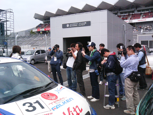 今回は初レース、初の富士のスピードウェイということもあって仕方ないですね。 次回はいつも練習をしている岡山国際サーキットなんで、次はがんばります。 o(^-^)o その後は、最後の公道車検と言うのがあって、それがコンソレーションレースの後からなので、勉強のため コンソレを一緒に見ることにして、それまでに時間が空いていたので、今回はGTと言うことで、 TRIALが今年スポンサーをしているGT300のアペクセラさんにお邪魔しました。 (^○^) アペクセラMR-Sと 『 まりる 』 で記念撮影をしたり、少しの間のんびりとさせて頂きました。 その間も、 『 まりる 』 はファンの人に囲まれたりで大変そうでした。