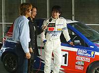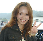 2002年10月6日(日) 台数は全部で、45台。車種はいつもながら、いろいろな車種がいましたが、特にクラス1のGT-Rが8台とNSXが4台は目立っていましたね! そして、こちらはスーパーオプションの華!はるなちゃんです。 走行会は、と申しますと・・・