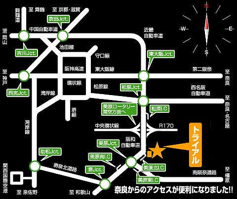A.大阪泉南方面より 1.阪和自動車道美原南出口後、約1.9km先Uターン B.吹田方面より 1.近畿道吹田より約40分 近畿自動車道→阪和自動車道美原北出口 Uターン後、400m先再度Uターン 2.阪神高速豊中より約40分 阪神高速環状線→阪神高速松原線→阪和自動車道美原北出口 Uターン後、400m先再度Uターン C.大阪市内方面より 1.阪神高速環状線→阪神高速松原線→阪和自動車道美原北出口 Uターン後、400m先再度Uターン D.神戸方面より 1.阪神高速環状線→阪神高速松原線→阪和自動車道美原北出口 Uターン後、400m先再度Uターン 2.阪神高速湾岸線(関空方面)→堺泉北道(100円高速)→阪和自動車道美原南出口後、約1.9km先Uターン E.奈良方面より 1.西名阪道天理より約40分 西名阪道→阪和自動車道美原北出口 Uターン後、400m先再度Uターン 2.奈良市内より 第二阪奈道→近畿自動車道→阪和自動車道美原北出口 Uターン後、400m先再度Uターン 3.奈良南部より 南阪奈自動車道美原東出口阪和道下交差点を右折後400m先Uターン F.和歌山方面より 1.阪和自動車道海南より約60分 阪和自動車道美原南出口後、約1.9km先Uターン |