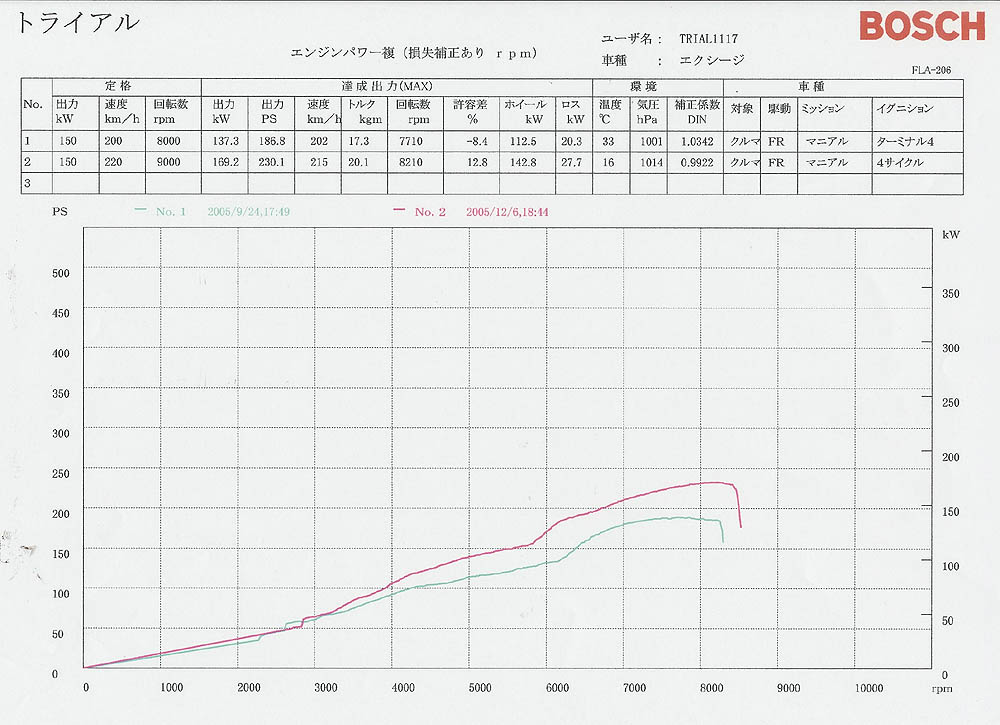 グラフを見て解るように、5速 3100 rpm から すでに 3ZZ エンジンの方がよりパワーが出てます。 そして、ロータス乗りの方なら体験されていると思いますが、 ノーマルは 6300 rpm でVVTが切り替わって、7700 rpm 位までは加速感があり、 その上は惰性で 8300 rpm 迄 回る感じです。