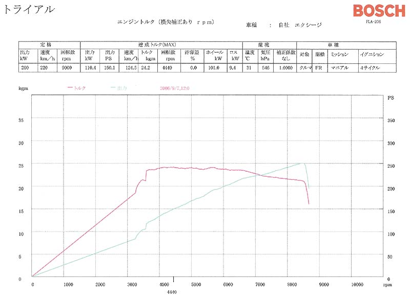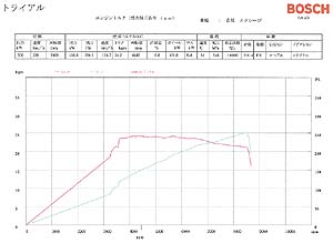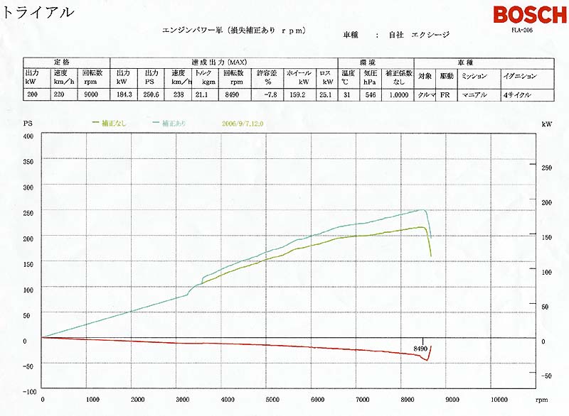 皆さんの興味あるパワーの方は、(グラフ参考) 8490rpm で 250.6ps という結果でした。
