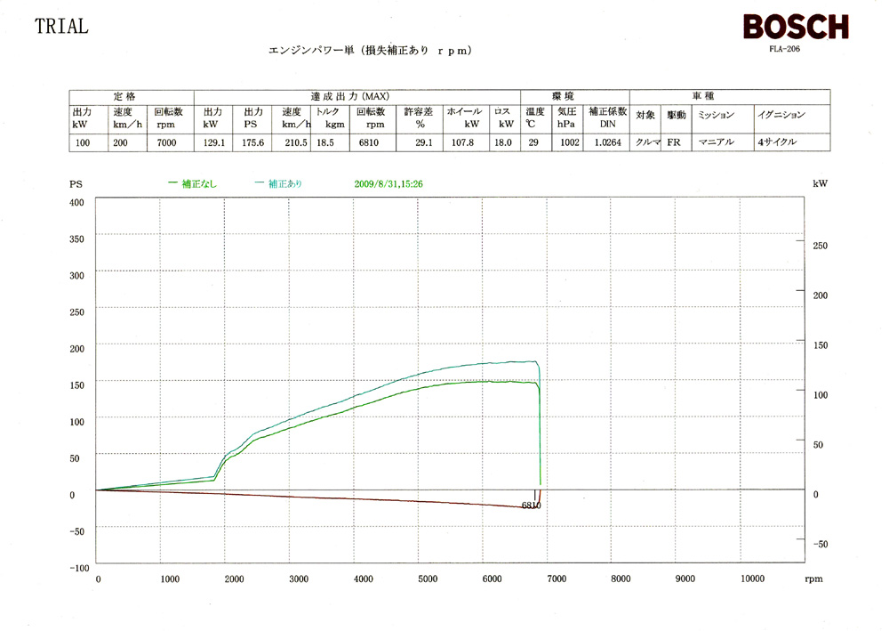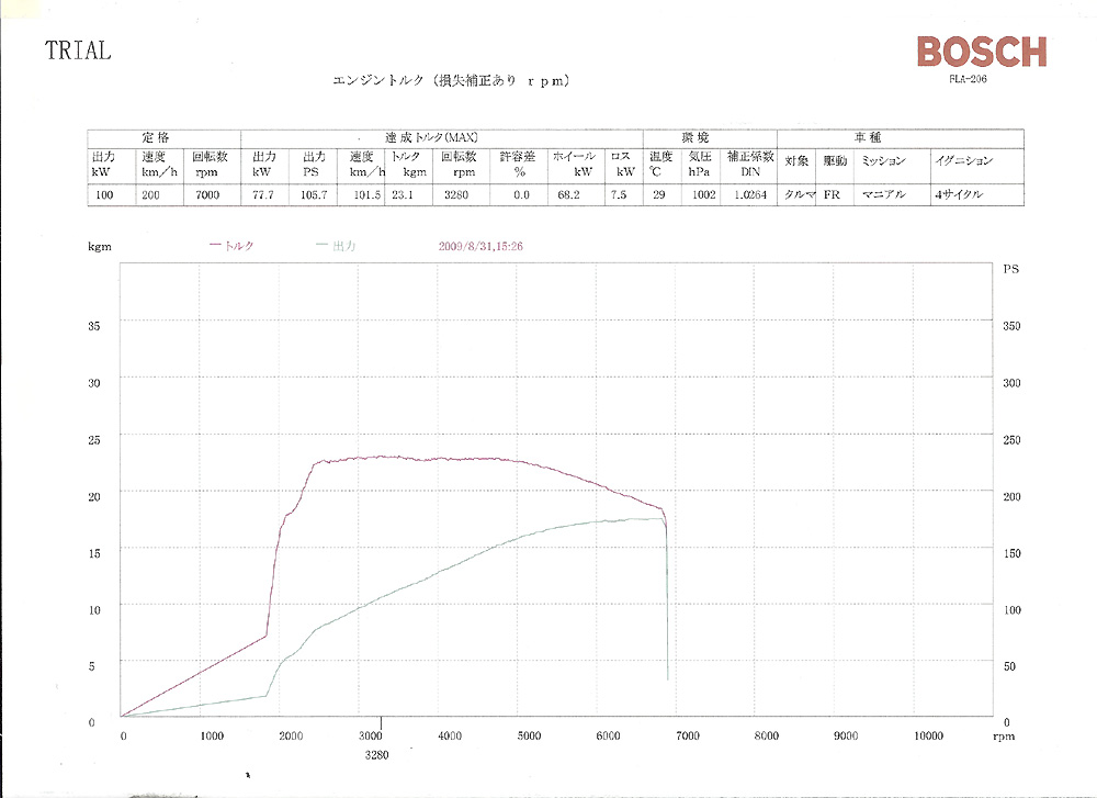 | 【 テスト車両データー 】 H15年式、6M/T エンジン 及び インジェクター、燃料ポンプ ノーマル トライアル EXマニ、キャタ、チタンマフラー |