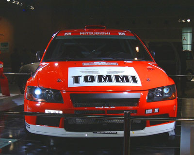 ミツビシのブースには、WRCシリーズドライバーチャンプのトミー・マキネンの名前がボンネットにデーンと貼ってあるランエボ。