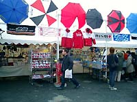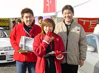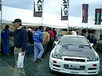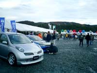 わたしたちのテントでは、ガレージトライアル高松の三浦代表と、イベント事にはいつもお手伝いにかけつけてくれる宅間君(HN:びー3)と一緒にニッサン車オーナー限定のカタログの配布とステッカーの販売をしてました。同じテントでSEVさんがSEV展示をしていましたが、カタログの配布を一緒に手伝ってくれました。(ありがとうございました!)テントが立っている所が、土と砂利の上でしかも、雨が上がったあとだったので足はどろどろになってしまいました。
